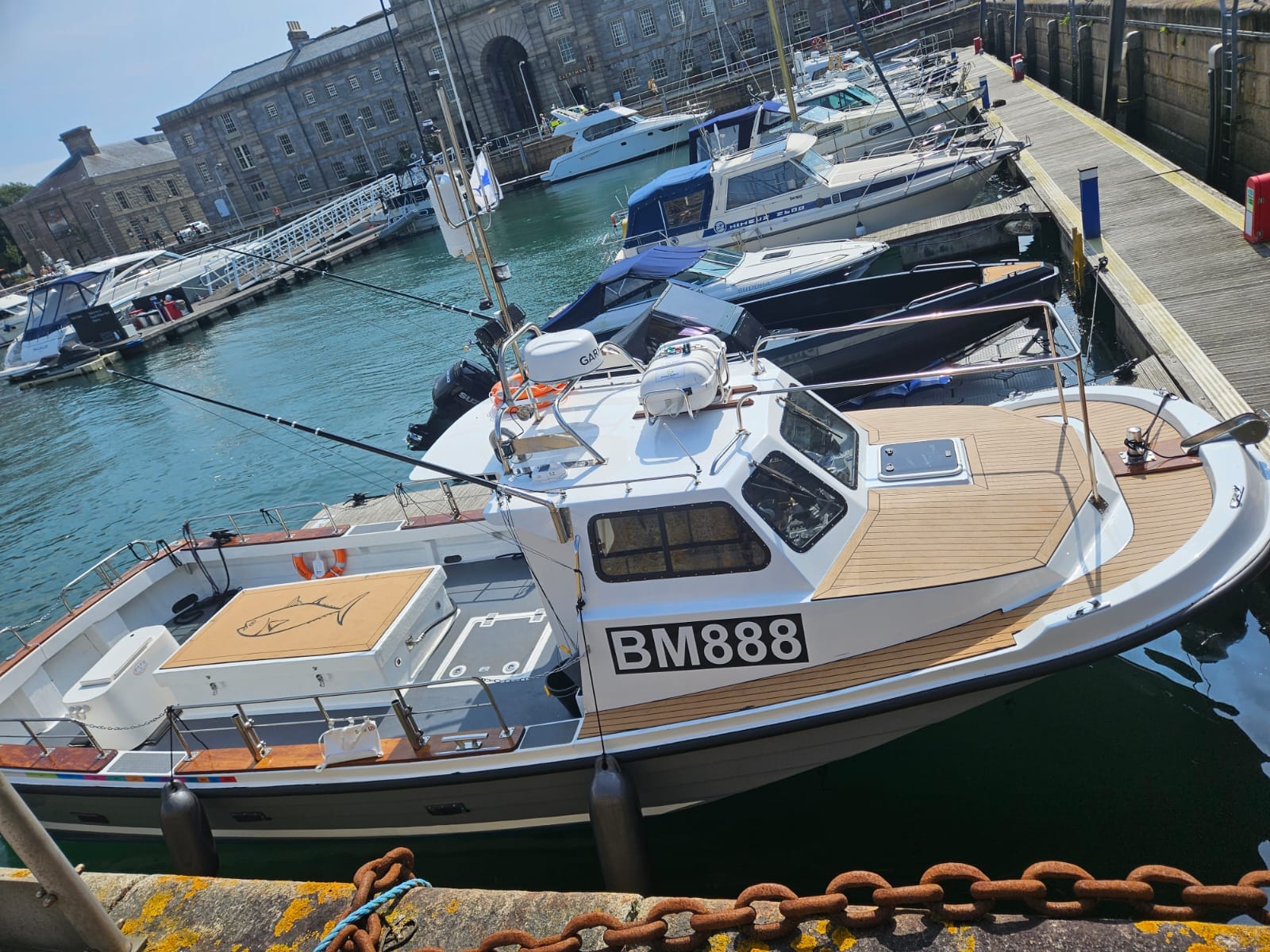Pechos Grandes, the renowned Devon fishing boat famous for record bluefin tuna catches features a 9mm Marinedeck 2000 deck.  The project was completed with a customised engine box design showcasing a detailed tuna carving machined into the cork composite.